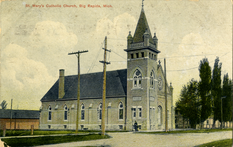View of St. Mary's Catholic Church in Big Rapids, Michigan. Printed on front: "St. Mary's Catholic Church, Big Rapids, Mich." Printed on back: "No. C14464. Pub. by Stillwell's Bazaar, Big Rapids, Mich. Rotochrome, Leipzig, Dresden, Berlin. Printed in Germany." Handwritten on back: "Dear Friend, Hope you are well and how are the rest of Deerfield people. Us children up here are fine and studing [sic] hard. Suppose you have plenty of snow. From friend Genevieve." Card is postmarked January 17, 1910.