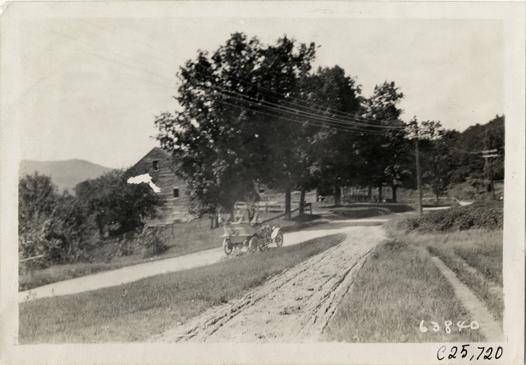 Distant rear view of motorists in Cino car no. 22 traveling on rural dirt road during the 1910 Munsey Historic Tour. Wooden-frame house on roadside. Organized by the Munsey newspapers, the endurance contest covered a route through ten states. Stamped on back: "Spooner & Wells, Inc., photographers, telephones 3472-3473 Columbus, 1931 Broadway, New York." Handwritten on back: "Tours--Munsey Historic Tour, 1910."
