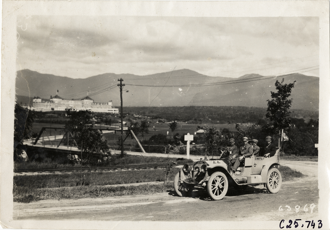 View of motorists in Cino car no. 22 traveling on rural dirt road at Bretton Woods, New Hampshire during the 1910 Munsey Historic Tour. Mt. Washington Hotel and bridge in background. Organized by the Munsey newspapers, the endurance contest covered a route through ten states. Stamped on back: "Spooner & Wells, Inc., photographers, telephones 3472-3473 Columbus, 1931 Broadway, New York." Handwritten on back: "Tours--Munsey Historic Tour, 1910."