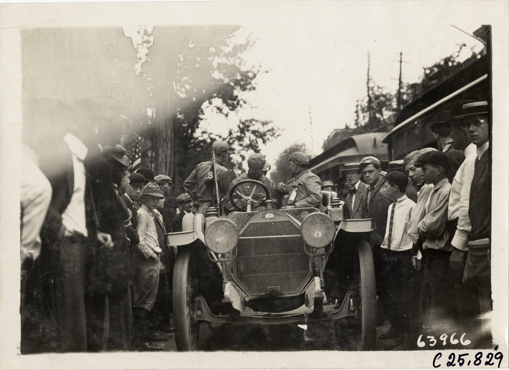 Spectators surrounding motorists in automobile, 1910 Munsey Historic Tour