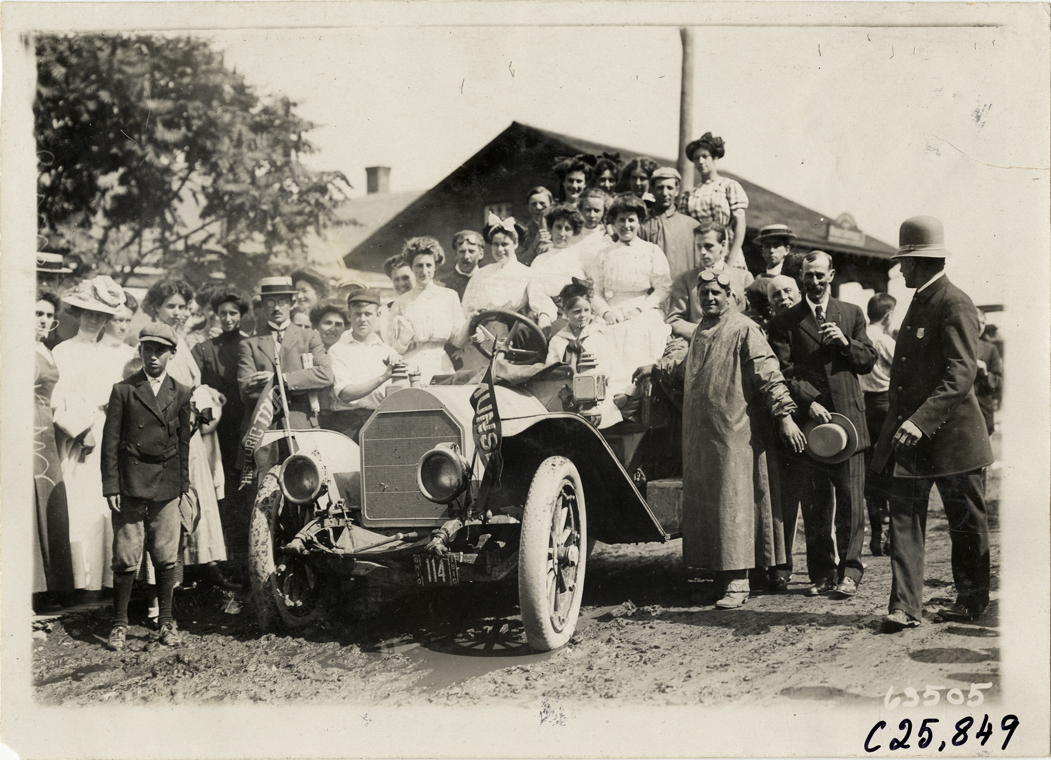 Spectators posing with automobile at North Conway, New Hampshire, 1910 Munsey Historic Tour