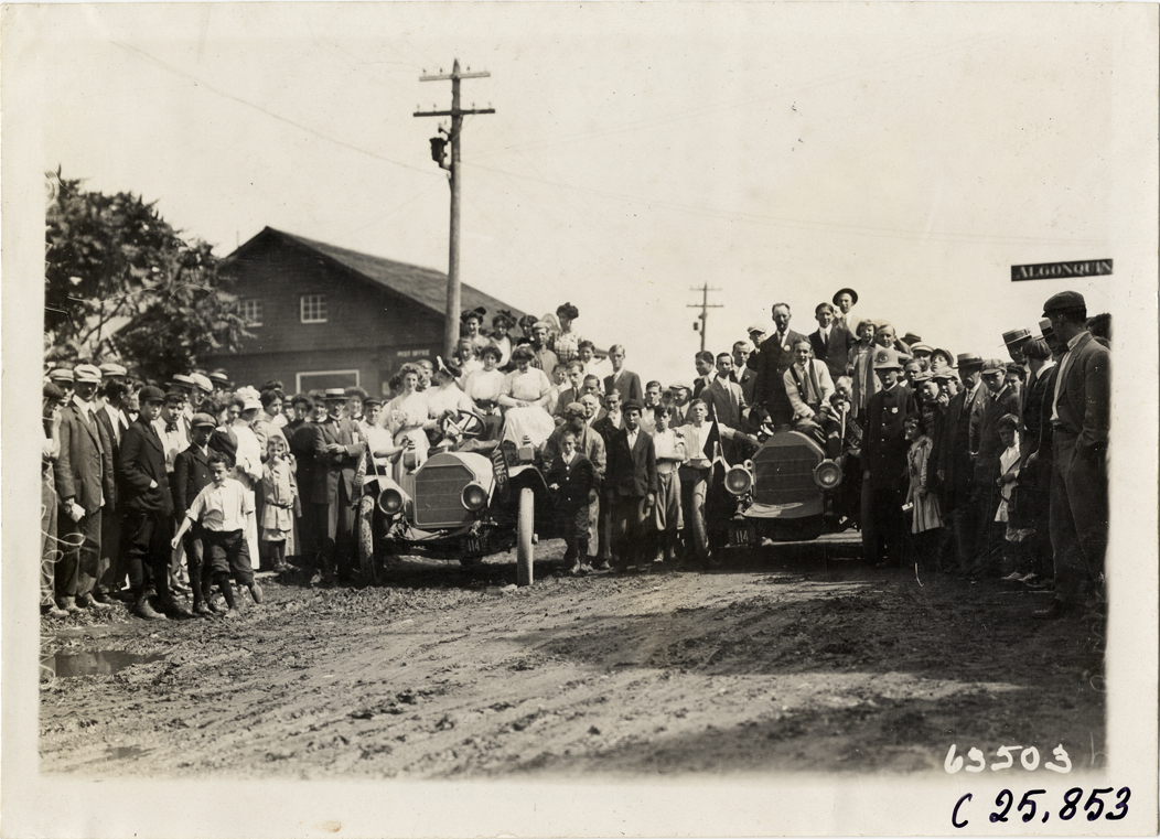 Spectators posing with automobiles at North Conway, New Hampshire, 1910 Munsey Historic Tour