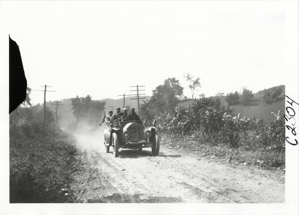 View of motorists in Ohio car no. 21 traveling on rural dirt road during the 1910 Munsey Historic Tour. Organized by the Munsey newspapers, the endurance contest covered a route through ten states. Handwritten on back: "#21 Ohio, model 40A touring, driven by Henwood. Tours--Munsey Historic Tour, 1910."
