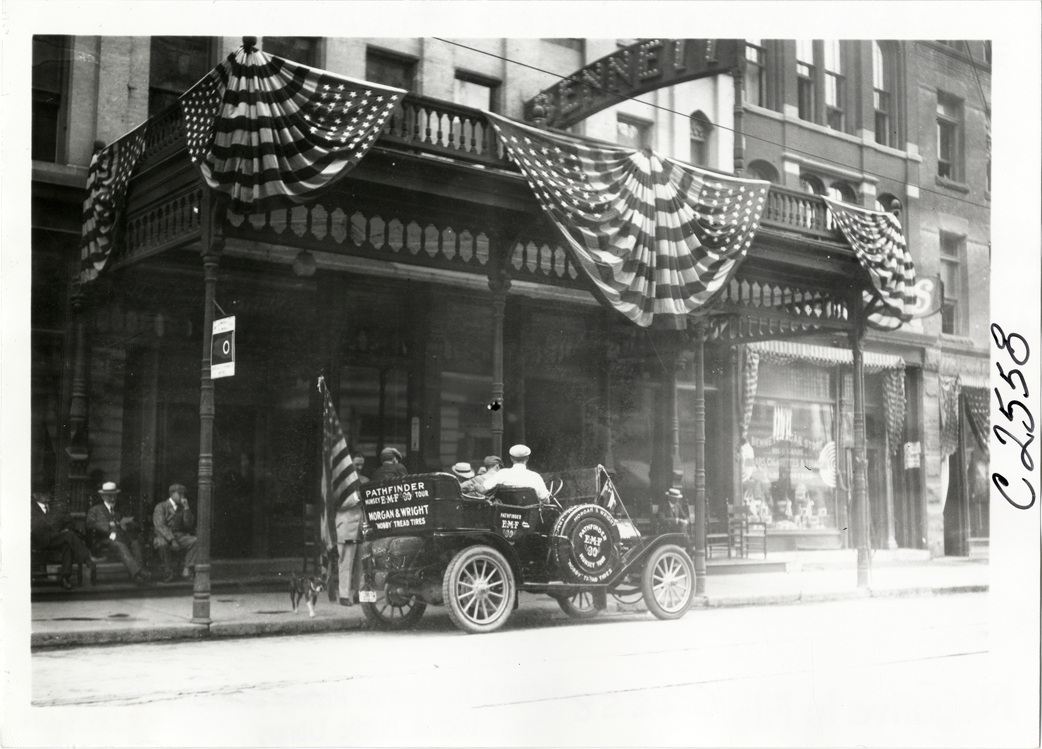 View of motorists in E-M-F pathfinder car in front of the Bennett Hotel during the 1910 Munsey Historic Tour. "Pathfinder Munsey Tour, E-M-F '30', Morgan & Wright 'nobby' thread tires" painted on back of car. Hotel balcony is decorated with bunting. Organized by the Munsey newspapers, the endurance contest covered a route through ten states. Handwritten on back: "E.M.F. path '30' pathfinder. Tours--Munsey Historic Tour, 1910."
