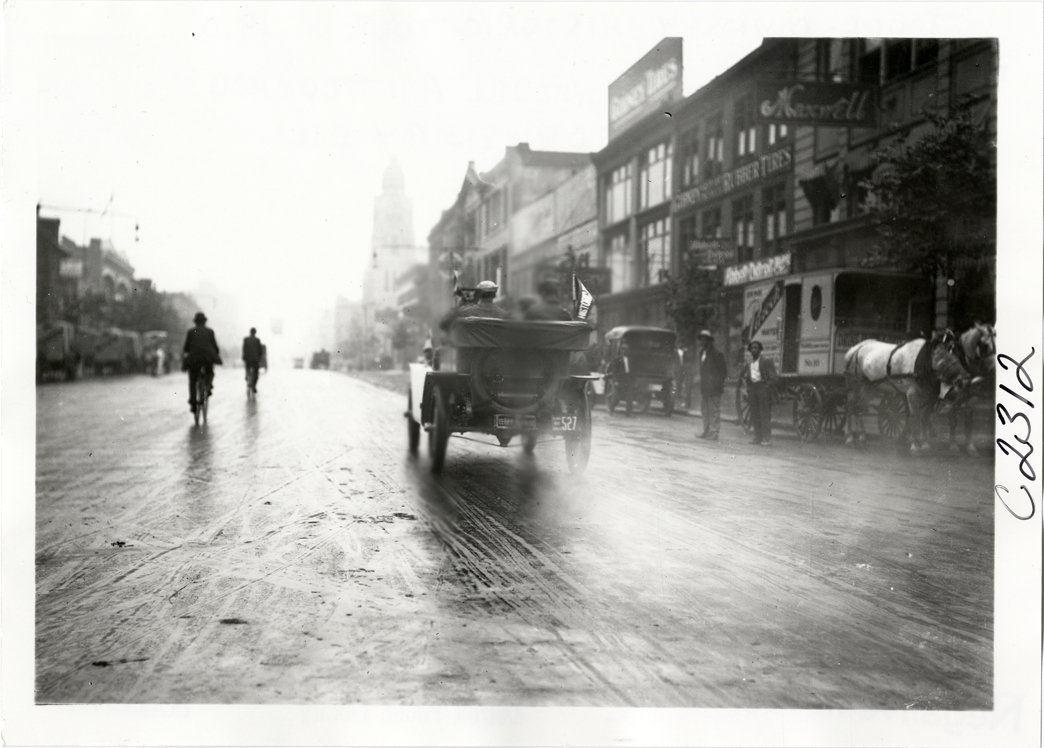 Motorists in Inter-State automobile traveling on street, 1910 Munsey Historic Tour