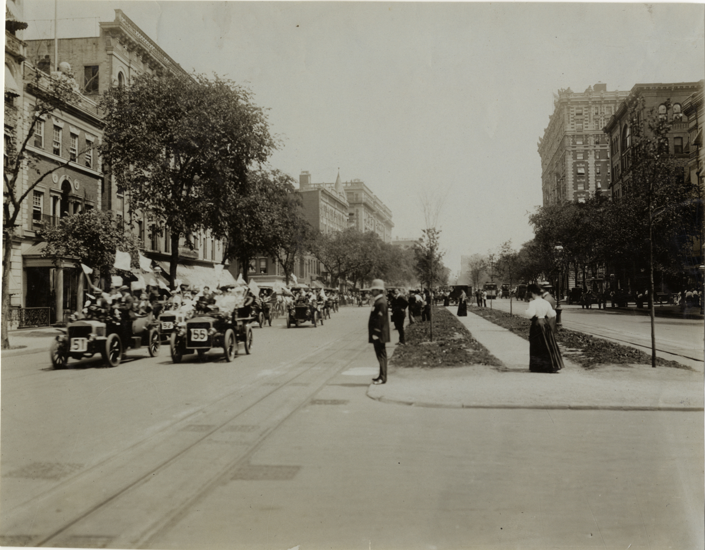 View of cars in parade on boulevard during the 1906 second annual excursion for orphans sponsored by the New York Motor Club. Some spectators stand on median; policeman in foreground. 1,200 children were taken on a trip to the Dreamland amusement park at Coney Island. Handwritten on back: "Tours--New York Orphans Day outing, 1906."