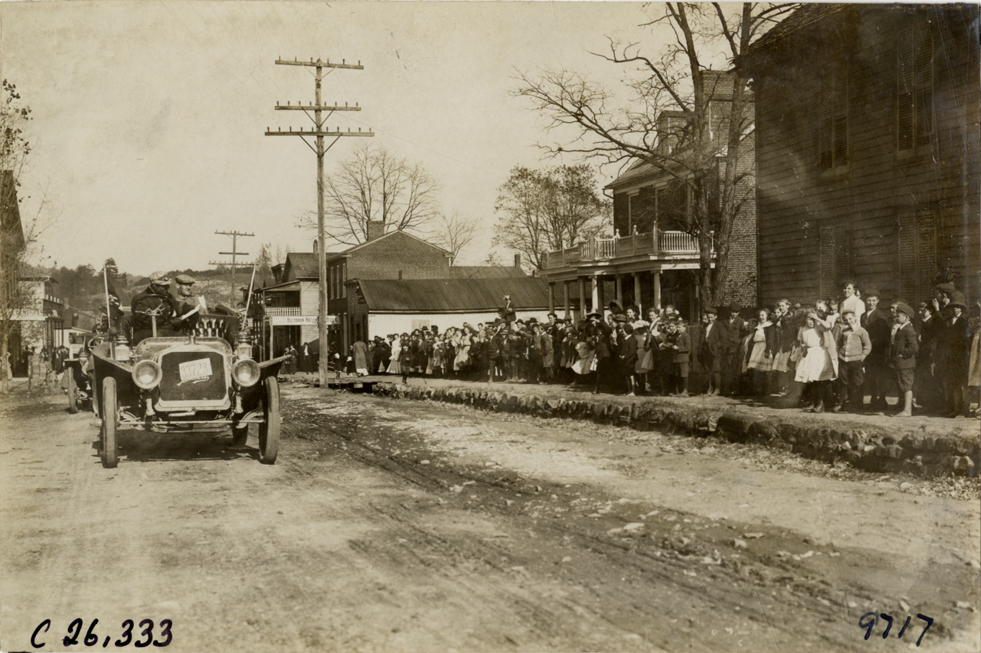 View of motorists in Mitchell pacemaker car passing spectators on roadside during the 1909 New York to Atlanta Good Roads Tour. Stamped on back: "Photo by N. Lazarnick. 244-6-8 W. 42nd Street, N.Y. Tel. 594 Bryant. In ordering duplicates mention number on back of this print." Handwritten on back: "Tours--New York-Atlanta Good Roads Tour, 1909."