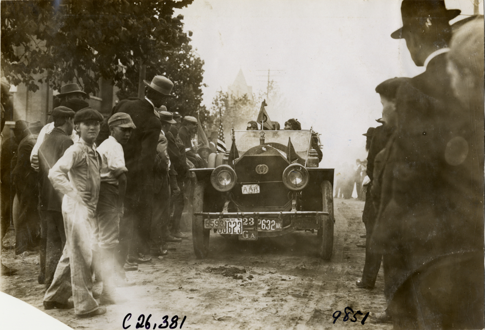 View of motorists in car, surrounded by spectators, during the 1909 New York to Atlanta Good Roads Tour. Stamped on back: "Photo by N. Lazarnick. 244-6-8 W. 42nd Street, N.Y. Tel. 594 Bryant. In ordering duplicates mention number on back of this print." Handwritten on back: "Tours--New York-Atlanta Good Roads Tour, 1909."