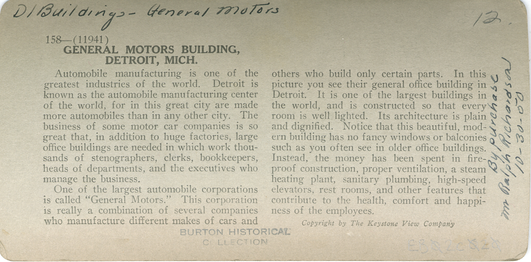 Gray mount. Dome topped. View of General Motors office building with cars parked in street in front of building and trees across street from building. Printed on front of stereocard: "Keystone View Company, manufacturers, publishers, copyrighted, made in the U.S.A., Meadville, Pa., New York, N.Y., Chicago, Ill., London, England, 158 (11941), General Motors office building, Detroit, Mich." Detailed description printed on back of card.