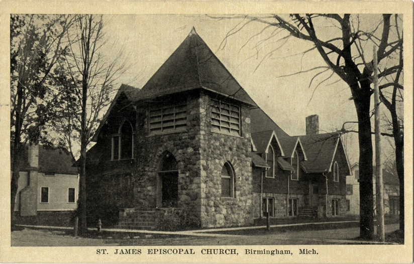 View of the St. James Episcopal Church in Birmingham, Michigan. Printed on front: "St. James Episcopal Church, Birmingham, Mich." Printed on back: "Ess and Ess Photo Co., Inc. 11 E. 17th St., New York, N.Y."