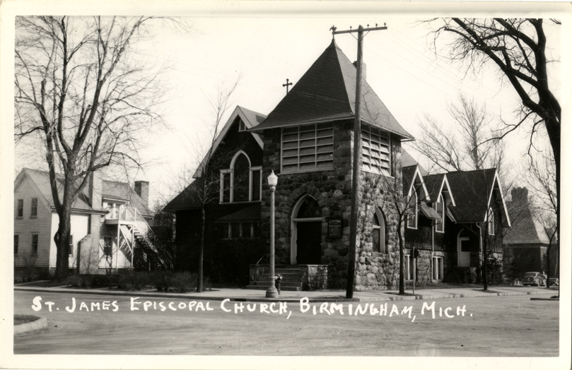View of the St. James Episcopal Church in Birmingham, Michigan. Printed on front: "St. James Episcopal Church, Birmingham, Mich."