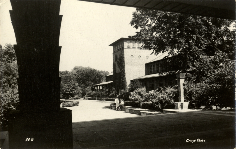 View of Kingswood School Cranbrook in Bloomfield Hills, Michigan. Printed on front: "Croze, photo." Printed on back: "Kingswood School Cranbrook, Bloomfield Hills, Mich. A boarding and day school for girls, one of six Cranbrook institutions."