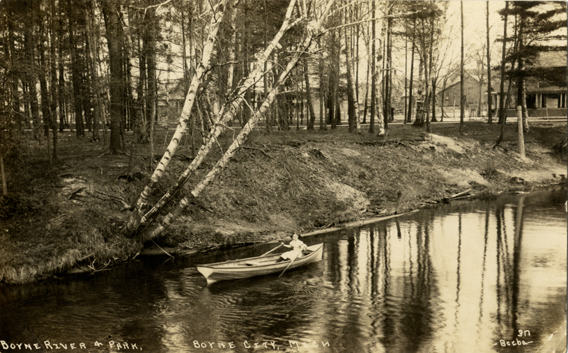 View of a girl canoeing on the Boyne River in Boyne City, Michigan. Printed on front: "Boyne River & park. Boyne City, Mich. Beebe." Printed on back: "Photo by E.L. Beebe, Kalkaska, Mich." Handwritten on back: "Feb. 13. All well and resting today. Sun is shining and looks like spring and wish it was. Hope this finds you well and O.K. As ever, P.H." Card is postmarked February 14, 1910.