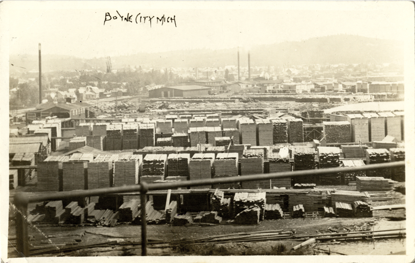 View of lumber stacked in lumber yard at Boyne City, Michigan. Printed on front: "Boyne City, Mich."