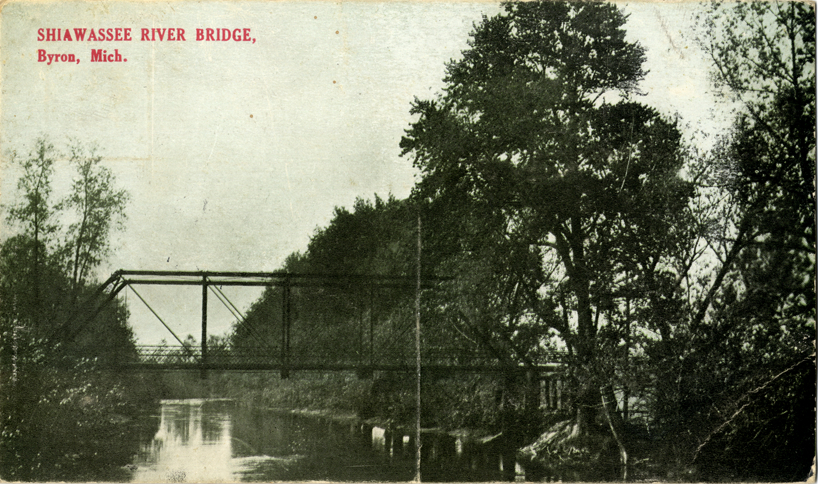 View of the Shiawassee River Bridge in Byron, Michigan. Handwritten on back: "6-20-12. Mrs. Christie, Can you bring or send me a crock of butter tonight or tomorrow." Card is postmarked June 20, 1912.