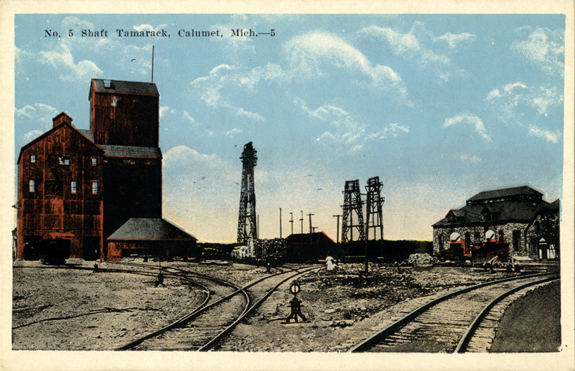 View of shaft no. 5 at the Tamarack Mine in Calumet, Michigan. Railroad tracks in foreground. Printed on front: "No. 5 shaft, Tamarack, Calumet, Mich. 5." Printed on back: "E.C. Kropp Co., Milwaukee."