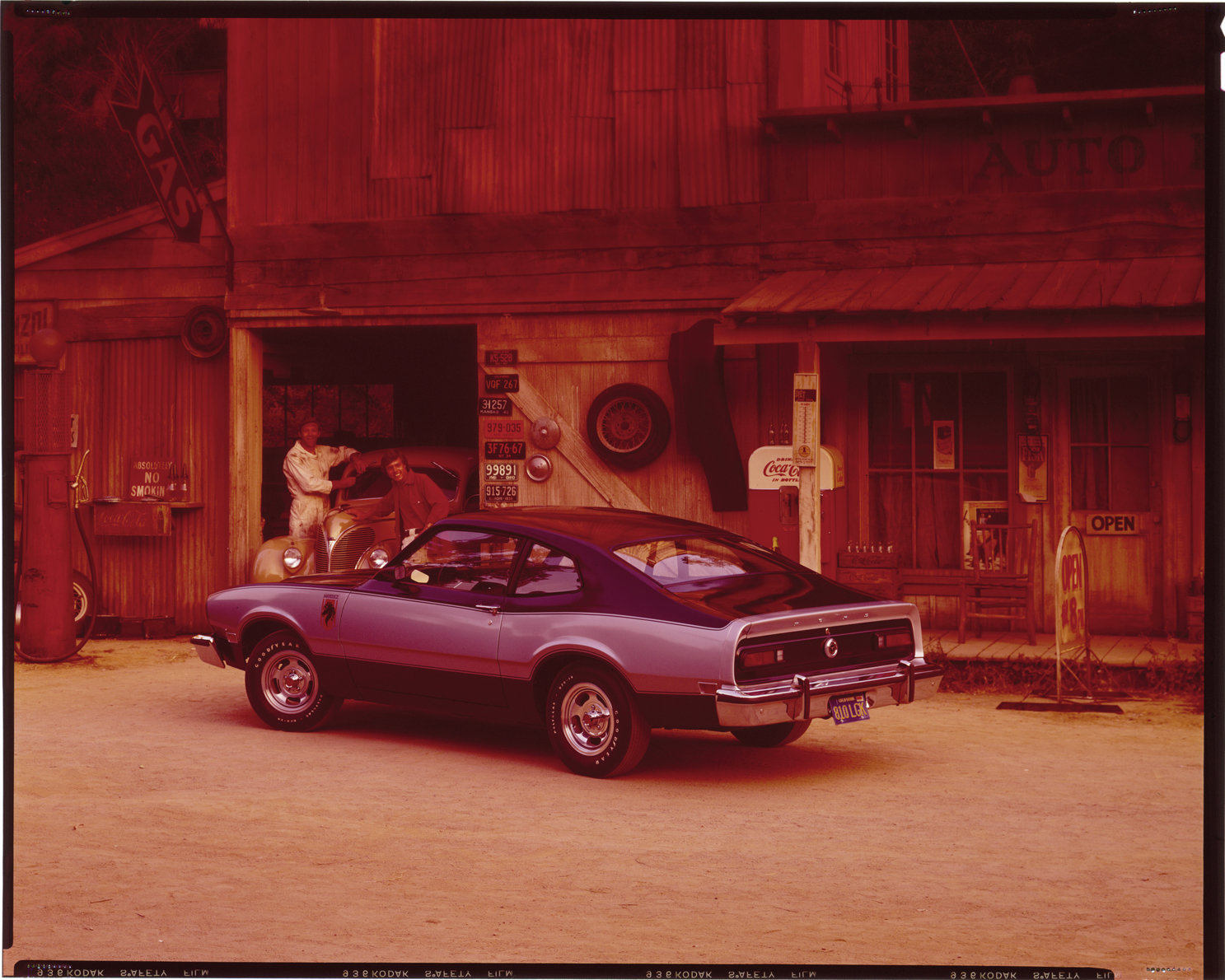 View of two men posing with a Ford Maverick Stallion coupe. Service station in background; license plates are displayed on building facade. Label on sleeve: "Ford Motor Co., Ford Maverick Stallion, 1976-77."