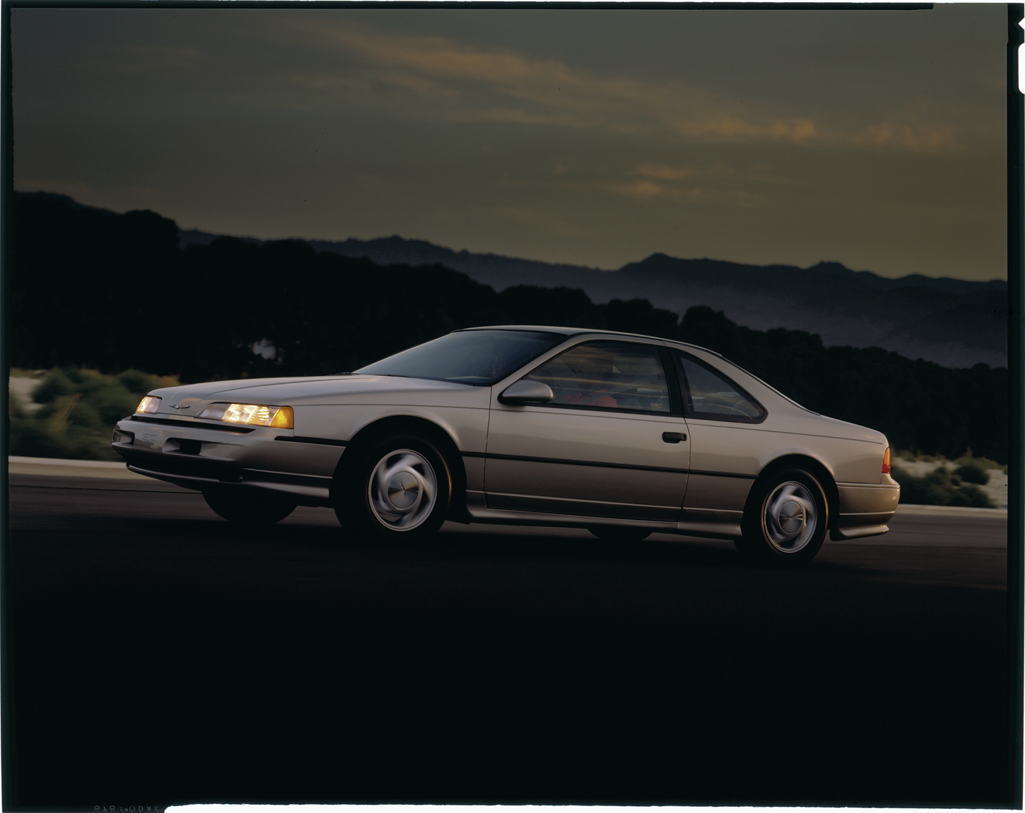 View of a man driving a Ford Thunderbird coupe. Label on sleeve: "Ford Motor Co., Ford Probe, 1989-97."