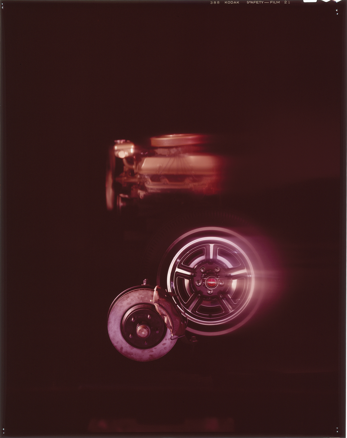 View of a Ford car engine, wheel and hub cap. Label on sleeve: "Ford Motor Co., advertising."