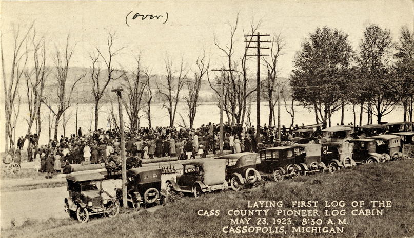 View of crowd watching the laying of the first log of the Cass County Pioneer Cabin in Cassopolis, Michigan. Cars parked in foreground. Printed on front: "Laying first log of the Cass County Pioneer Log Cabin, May 23, 1923, 8:30 a.m. Cassopolis, Mich." Handwritten on front: "Over." Handwritten on back: "The 1st log, a 26 ft black walnut was placed at 8:30 am witnessed by 3000 people, many from 50 miles drive. Carried to place by 24 men as the band played and the 3000 voices sang 'Home sweet home.'"