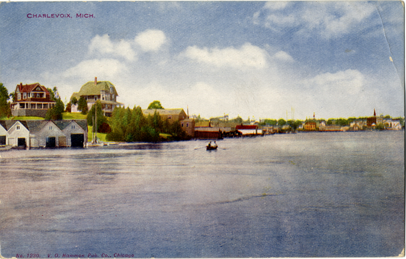 View of the lake shoreline in Charlevoix, Michigan, showing houses and other buildings. Boaters in rowboat background. Printed on front: "Charlevoix, Mich." Printed on back: "V.O. Hammon Publishing Co., Chicago."