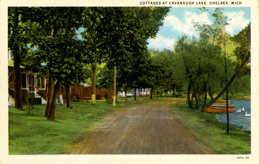 View of a row of wooden-frame summer cottages along a dirt road at Cavanaugh Lake in Chelsea, Michigan. Printed on front: "Cottages at Cavanaugh Lake, Chelsea, Mich." Printed on back: "Published by Burg's Drug Store, Chelsea, Mich. C.T. American Art Colored. CT & Co., Chicago."