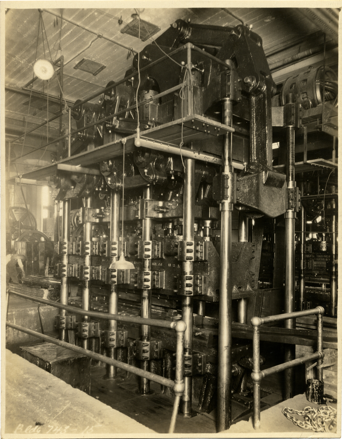 View of a frame press in the Willys-Overland Company factory. Typed on back: "Frame press." Handwritten on back: "Factories--Willys-Overland."