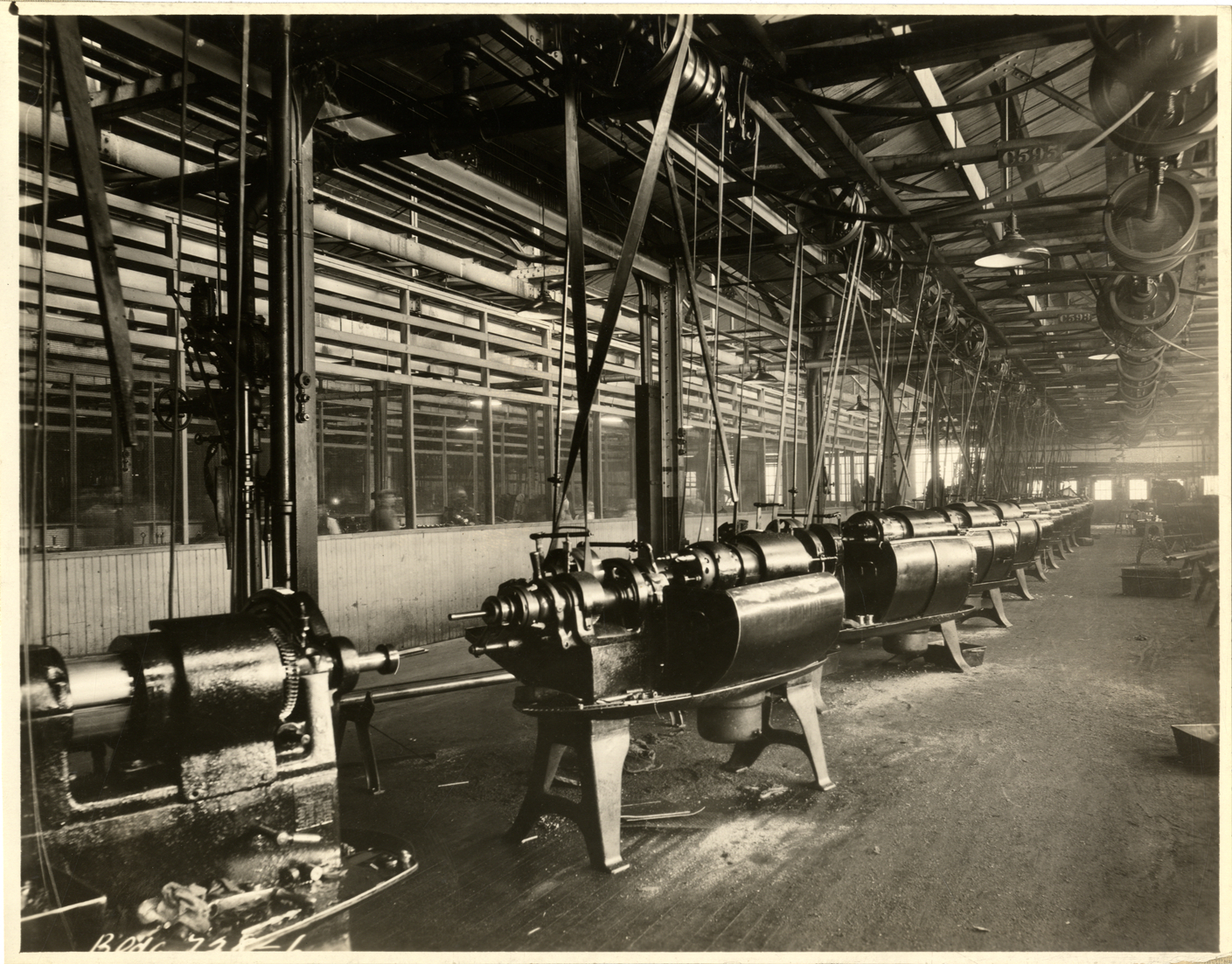 View of a row of automatic screw machines at the Willys-Overland Company factory. Typed on back: "4. Automatic screw machines." Handwritten on back: "Factories--Willys-Overland."