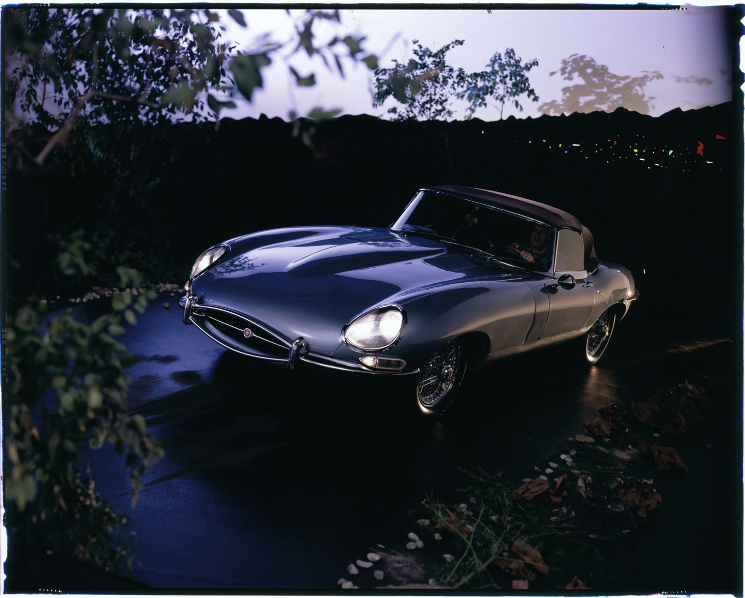 View of a man driving a Jaguar XKE coupe. Label on sleeve: "Jaguar XKE, 1960s."