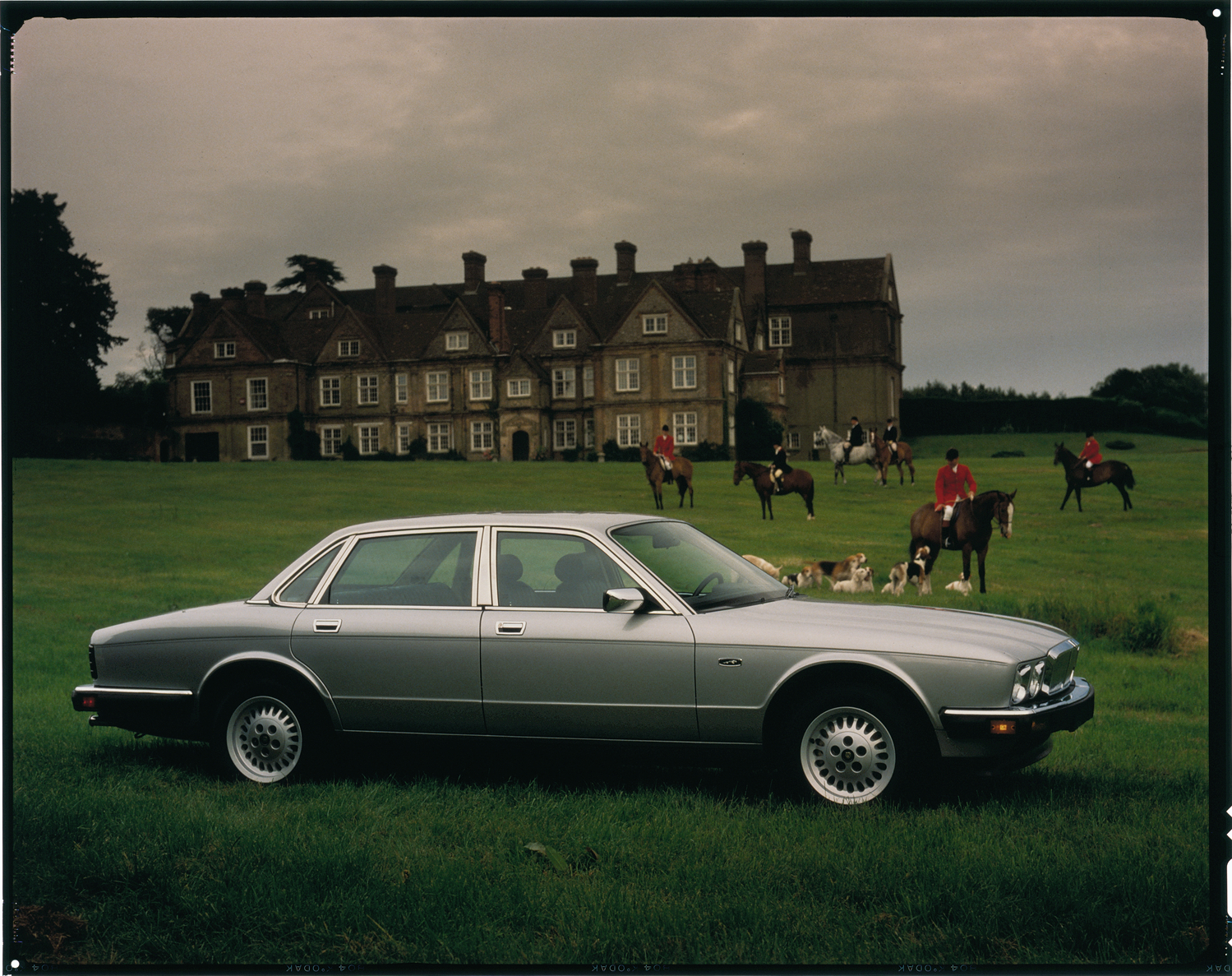 View of a Jaguar XJ6 sedan. Country house and fox hunting party in background. Label on sleeve: "Jaguar XJ6, 1980-90s."