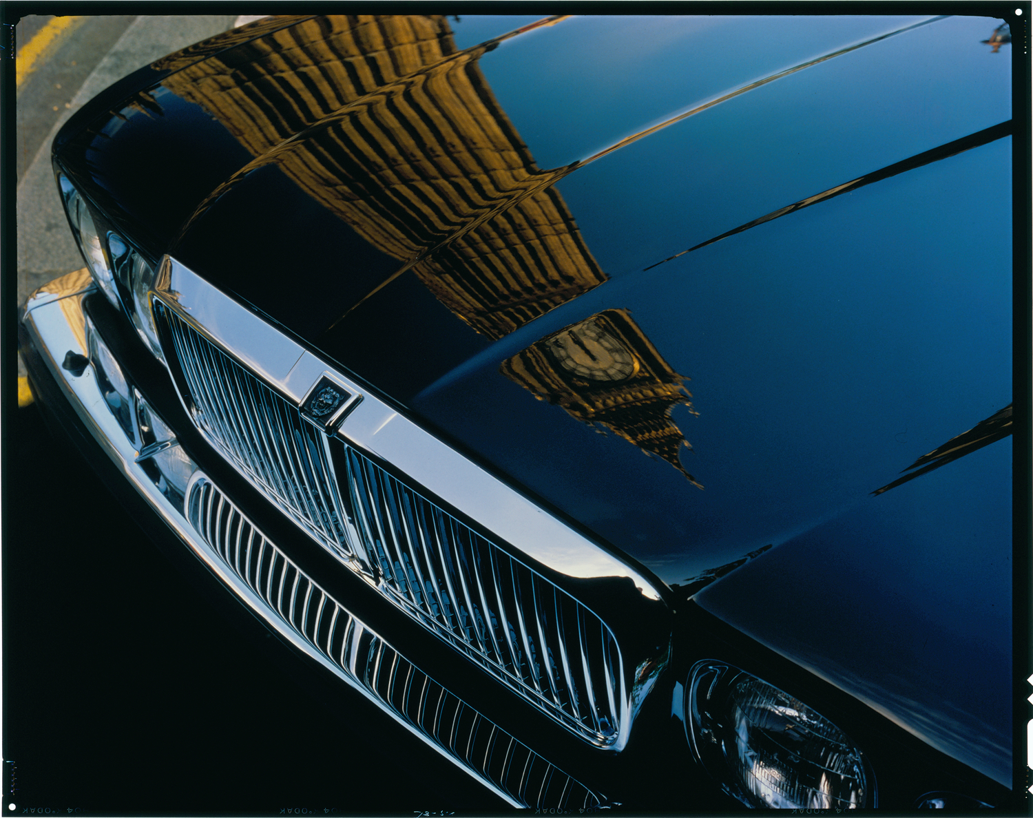 Close-up view of the front of end of a Jaguar automobile, showing grille and headlights. Big Ben clock is reflected on hood. Label on sleeve: "Jaguar, front end, year unknown."