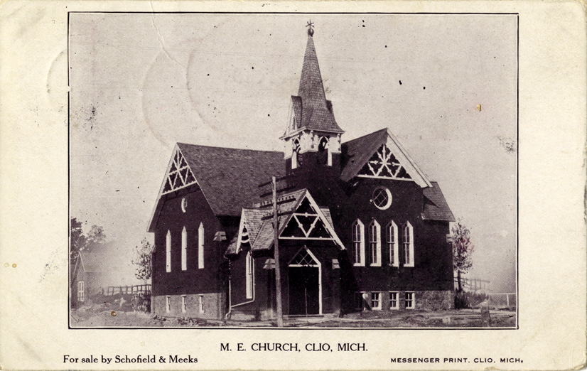 View of the First Methodist Episcopal Church in Clio, Michigan. Printed on front: "M.E. Church, Clio, Mich. For sale by Schofield & Meeks. Messenger Print, Clio, Mich." Handwritten on back: "A Merry Christmas and a Happy New Year to you. Are you in the new house yet? I often think of you and wonder how you are getting along. Kind regards to [undecipherable]. Bertha." Card is postmarked December 23, 1907.