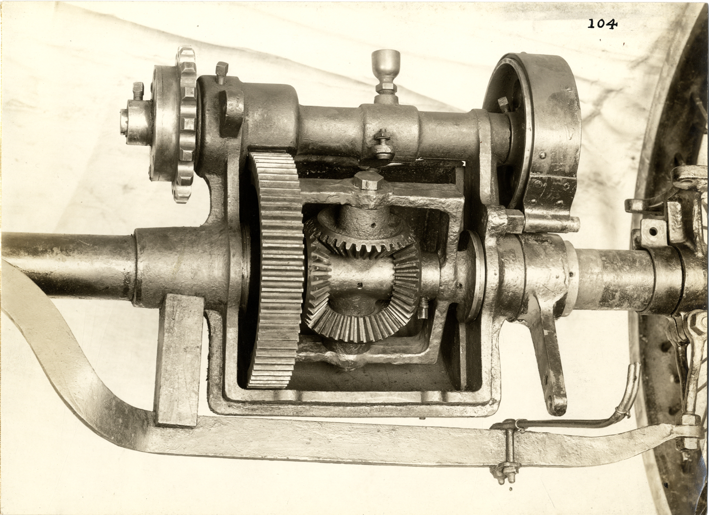 Close-up view of a differential assembly for an unidentified car. Handwritten on back: "Subject: Automobiles--Design and construction (Duryea). Collection: MS3/Charles E. Duryea Collection. Date: c. 1895-1905. Source: Estate of Charles E. & M. Jerry Duryea. I.D.: Unknown."