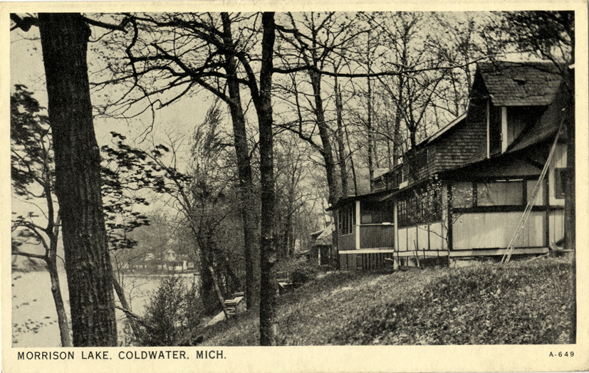 View of houses along the shore of Morrison Lake in Coldwater, Michigan. Printed on front: "Morrison Lake, Coldwater, Mich." Printed on back: "Mfd. by Fort Wayne Printing Co., Fort Wayne, Ind."