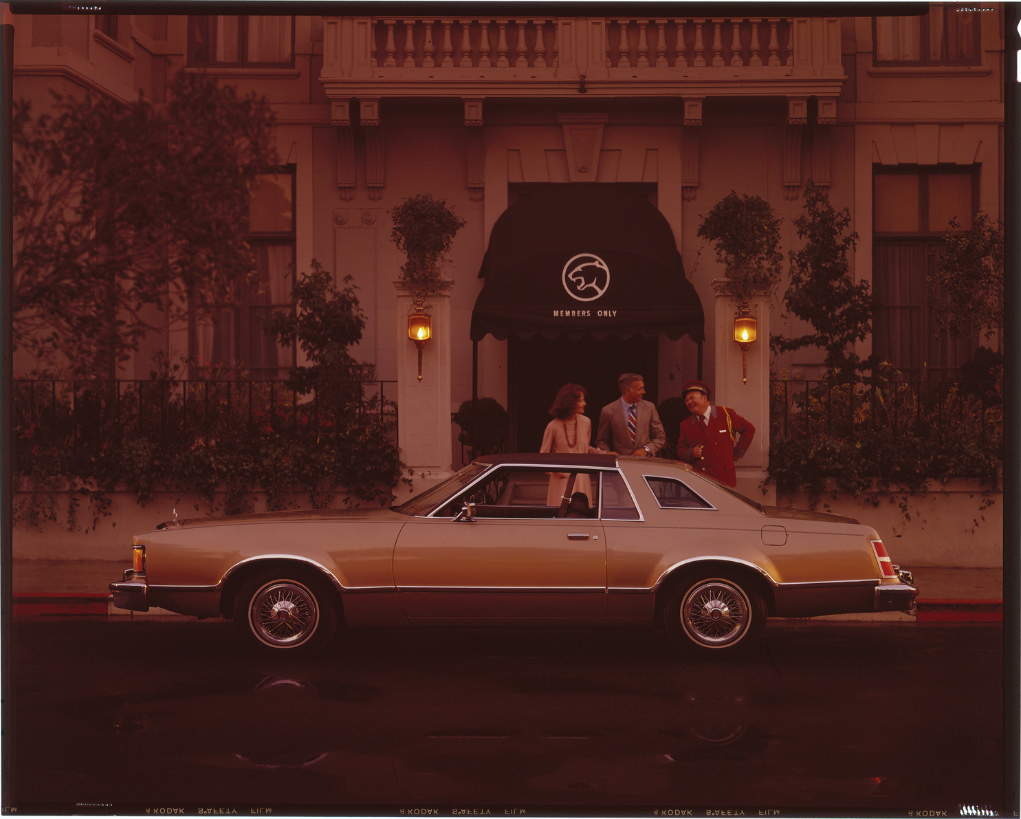 View of a man, woman and doorman posing with a Ford LTD coupe. Stone building with "Members only" awning in background. Label on sleeve: "Ford Motor Co., Ford LTD, 1979-80."