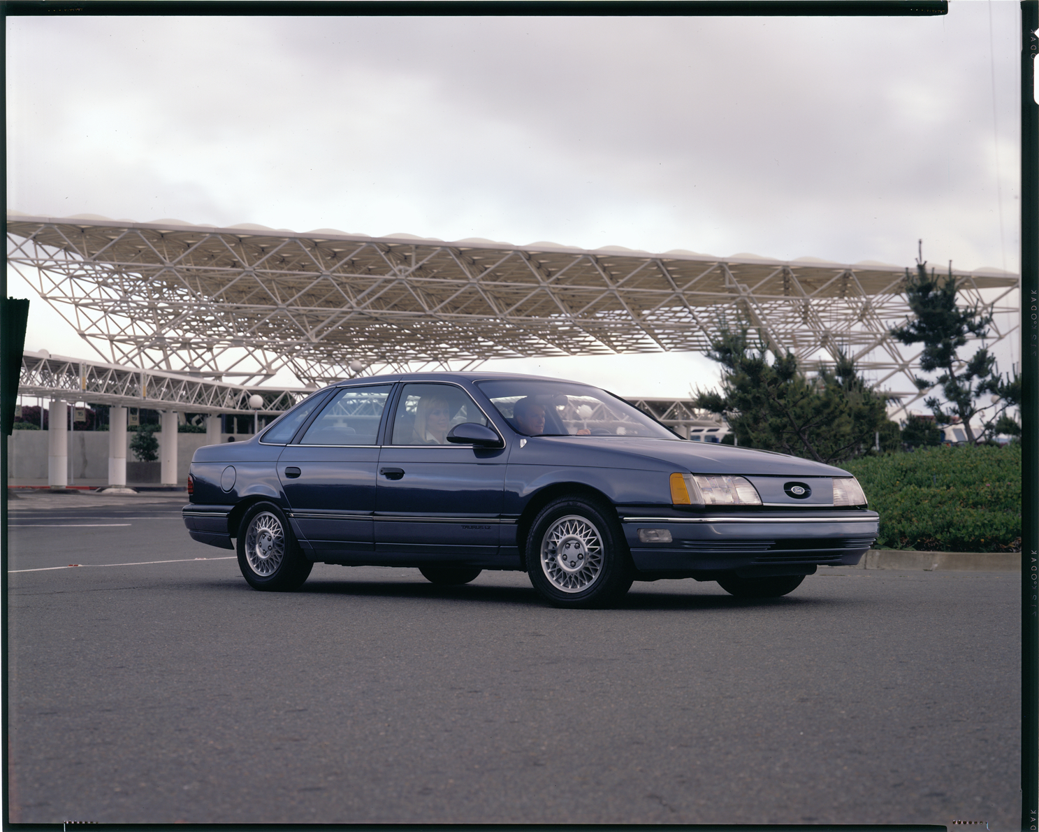 View of a man and woman in a Ford Taurus sedan. Label on sleeve: "Ford Motor Co., Ford Taurus, 1986-88."