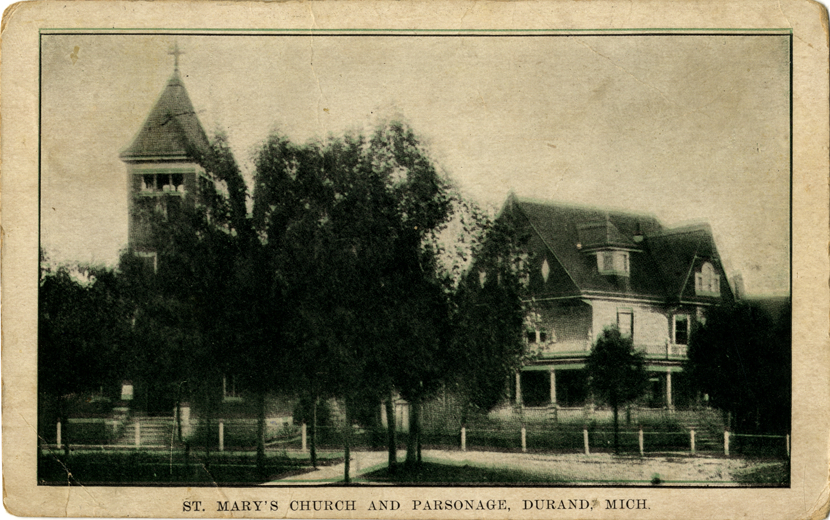 View of St. Mary's Catholic Church and rectory in Durand, Michigan. Printed on front: "St. Mary's Church and parsonage, Durand, Mich." Handwritten on back: "Apr 9, 1910. Helo Kids, how are you. I am fine I received your letter Mon. Was glad to hear from you. I will send my picture soon. Love from Laura."