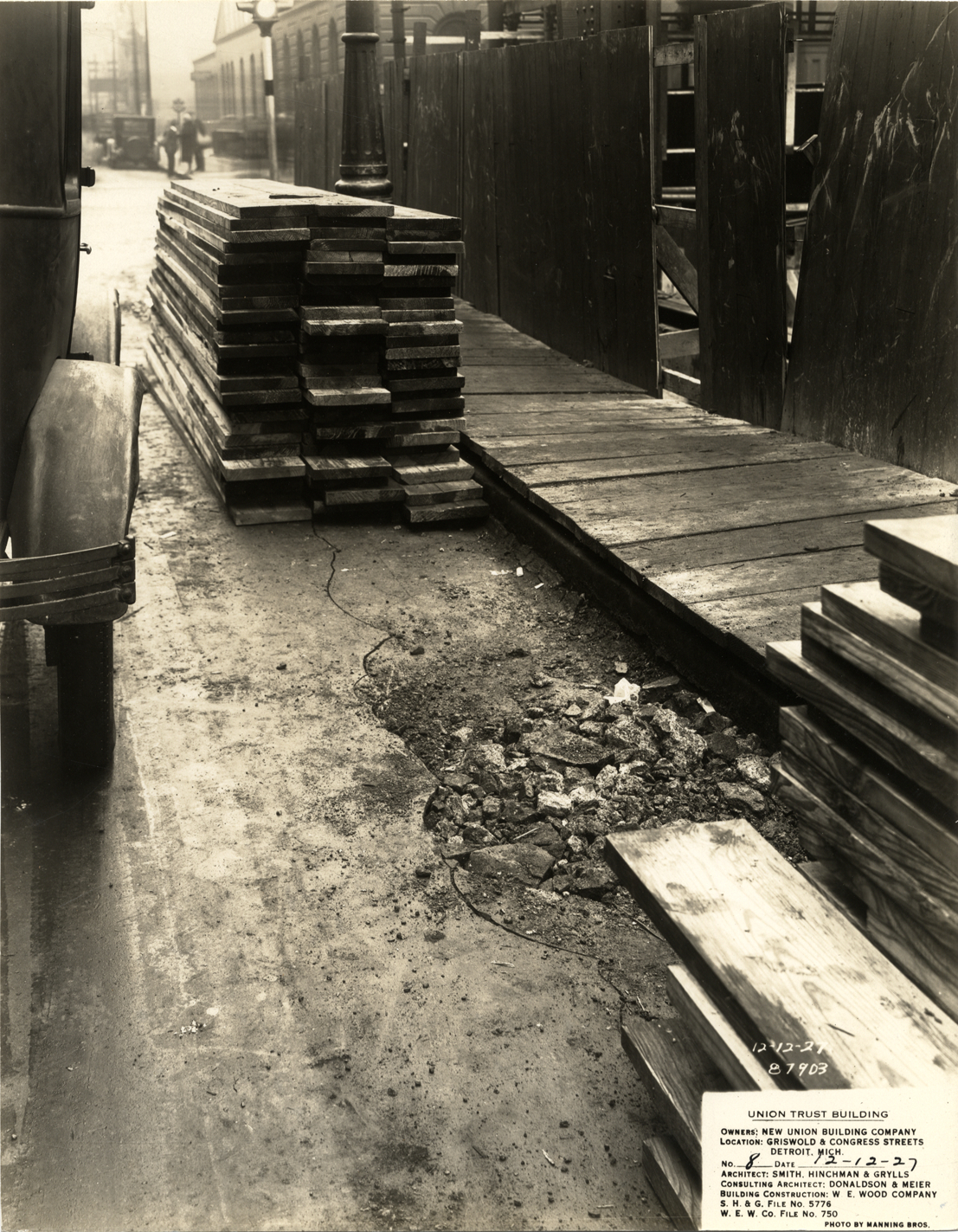 Close-up view of crumbling section of pavement on the construction site of the Union Guardian Building. Stack of lumber in foreground and background. The building was also known as the Guardian Building and the Union Trust Building. Printed on front: "Union Trust Building. Owners: New Union Building Company. Location: Griswold & Congress Streets, Detroit, Mich. No. 8. Date: 12-12-27. Architect: Smith, Hinchman & Grylls. Consulting architect: Donaldson & Meier. Building construction: W.E. Wood Company. S.H. & G. file no. 5776. W.E.W. Co. file no. 750. Photo by Manning Bros. 12-12-27, 87903."