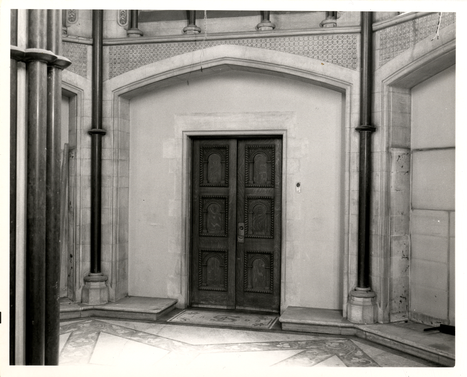 View of interior wooden door in the Scripps Branch Library, Detroit Public Library. Handwritten on back: "Scripps Library, Trumbull and Grand River."