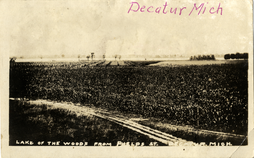 Distant view of Lake of the Woods at Decatur, Michigan. Field in foreground. Printed on front: "Lake of the Woods from Phelps St., Decatur, Mich." Handwritten on front: "Decatur, Mich." Handwritten on back: "Dear Hubby, I send you a bag of potatoes and bushel apples. Ann." Card is postmarked 1920.