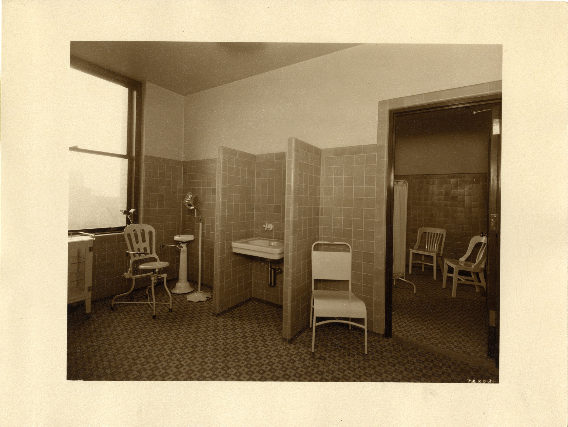 View of a corner of the infirmary on the 9th floor of the Union Guardian Building, showing two chairs, privacy screen and a wheelchair. The building is also known as the Guardian Building and the Union Trust Building. Stamped on back: "Grossman Knowling Lehr, 400 Marquette Bldg., Detroit, Michigan. File number 21." Handwritten on back: "Infirmary, 9th fl."