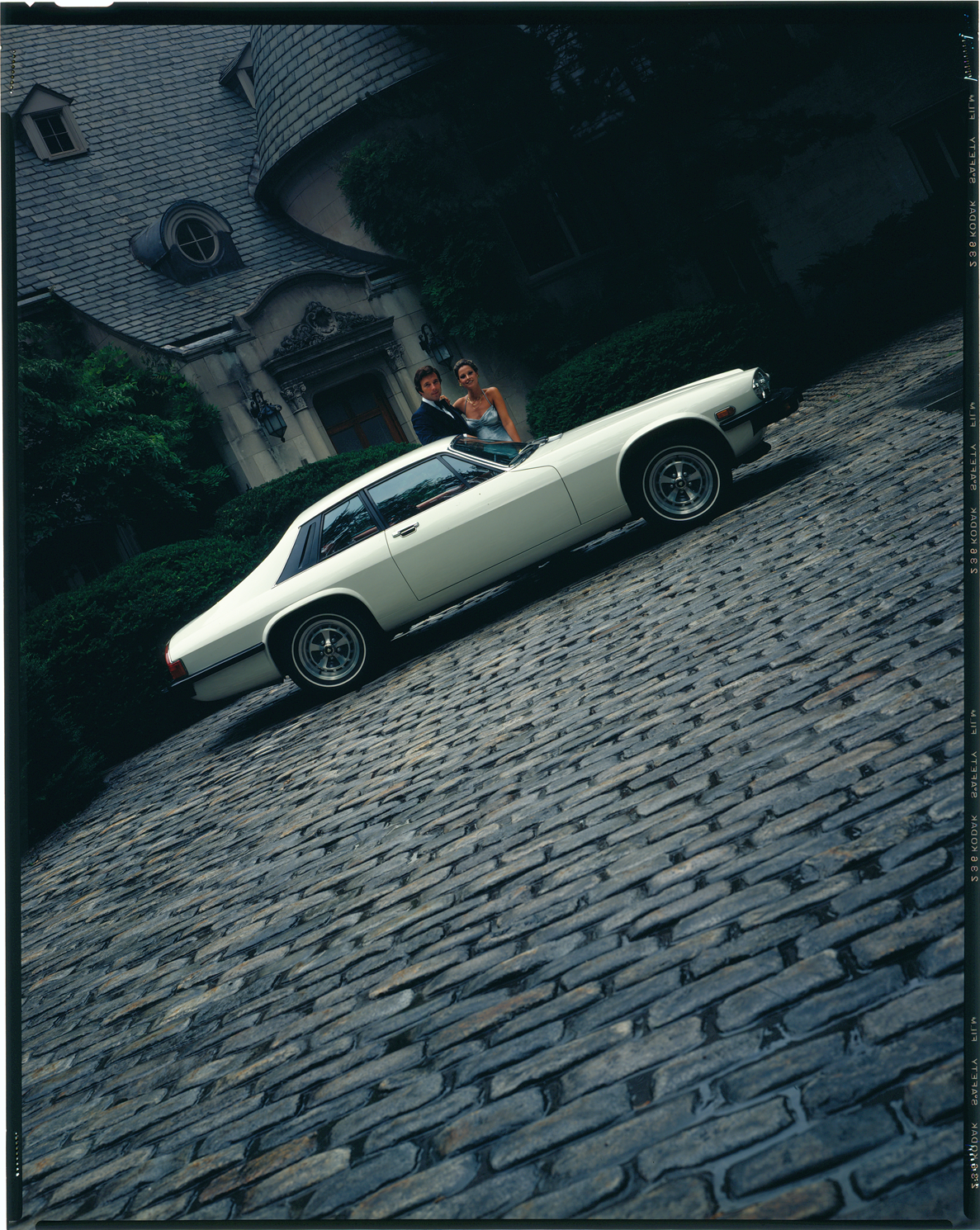View of a man and woman posing with a Jaguar XJ-S coupe. Label on sleeve: "Jaguar, Jaguar XJS, 1976-90."