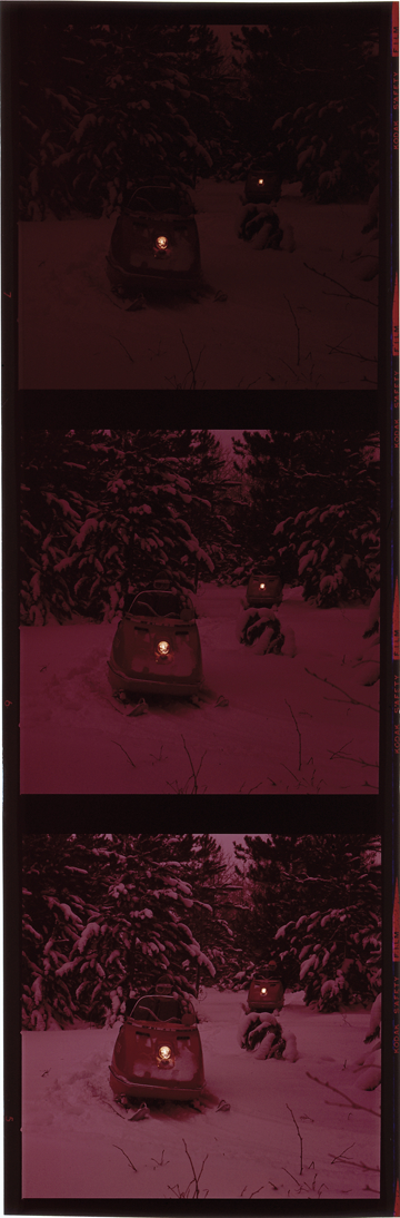 Three views of men riding two Rupp Sno-Sport snowmobiles. Label on sleeve: "Rupp Manufacturing, Sno-Sport, date unknown."