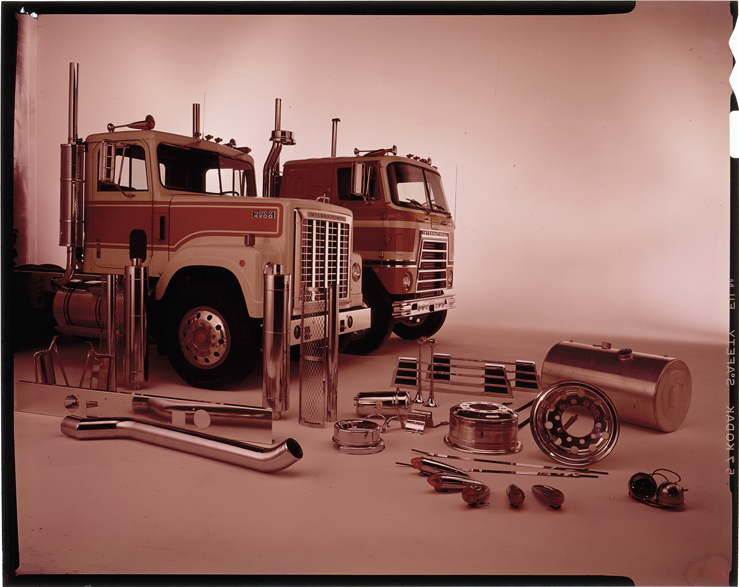View of two International truck cabs, with a display of truck parts. Label on sleeve: "International Harvester, International truck, date unknown."