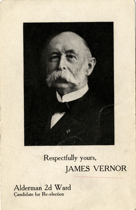 View of campaign literature for James Vernor, candidate for alderman of the 2nd Ward in Detroit, Michigan. Printed on front: "Respectfully yours, James Vernor. Alderman 2d Ward, candidate for re-election." Includes inset portrait. Handwritten on back: "Vernor, James, Sr."