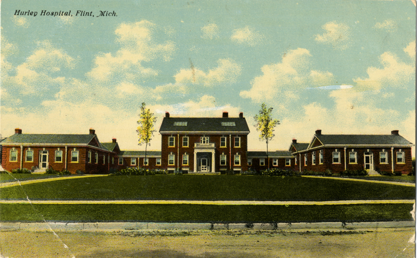 View of Hurley Hospital in Flint, Michigan. Printed on front: "Hurley Hospital, Flint, Mich." Printed on back: "Published by S.S. Kresge. Made in U.S.A."
