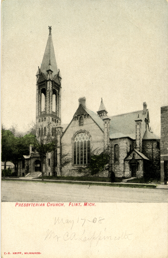 View of the First Presbyterian Church in Flint, Michigan. Printed on front: "Presbyterian Church, Flint, Mich. E.C. Kropp, Milwaukee." Handwritten on front: "May 17, 08. Mr. CA Lippincott."