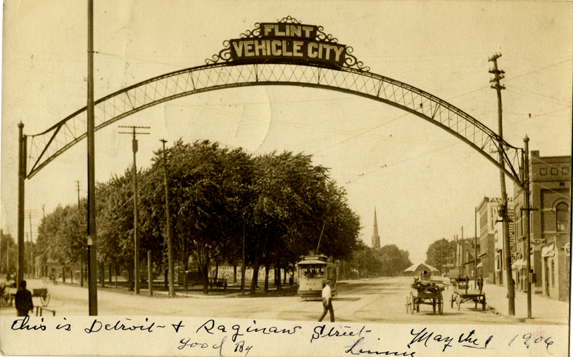 View of the Flint Vehicle City arch at the intersection of Detroit and Saginaw Streets in Flint, Michigan. Streetcar and horse-drawn vehicles in street. Handwritten on front: "May the 1, 1906. This is Detroit & Saginaw Street. Good by, Linnie." Card is postmarked May 2, 1906.