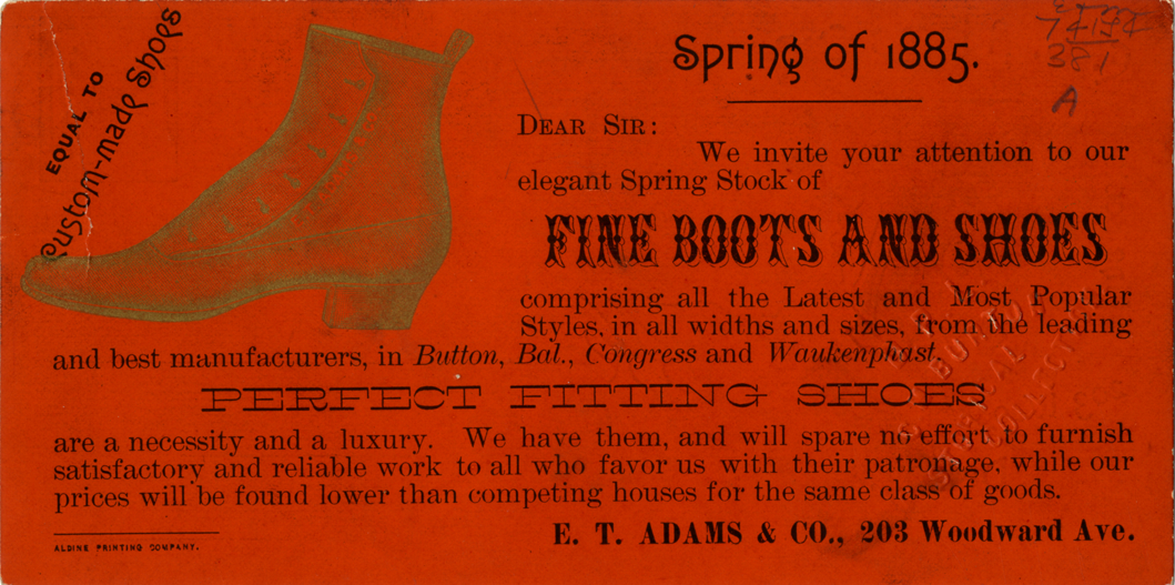 View of an advertising card for E.T. Adams & Co., depicting a shoe. Printed on front: Spring of 1885. Dear Sir: We invite your attention to our elegant spring stock of fine boots and shoes comprising all the latest and most popular styles, in all widths and sizes, from the leading and best manufacturers, in Button, Bal., Congress and Waukenphast. Perfect fitting shoes are a necessity and a luxury. We have them and will spare no effort to furnish satisfactory and reliable work to all who favor us with their patronage, while our princes will be found lower than competing hosues for the same class of goods. E.T. Adams & Co., 203 Woodward Ave. Equal to custom-made shoes. Alpine Printing Company."
