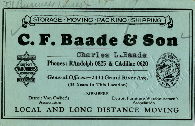 View of a business card for C.F. Baade & Son. Printed on front: "C.F. Baade & Son, storage, moving, packing, shiping. Charles L. Baade. Phones: Randolph 0825 & Cadillac 0620. General offices, 2434 Grand River Ave., 35 years in this location. Members Detroit Van Owner's Association, Detroit Furniture Warehousemen's Association. Local and long distance moving."